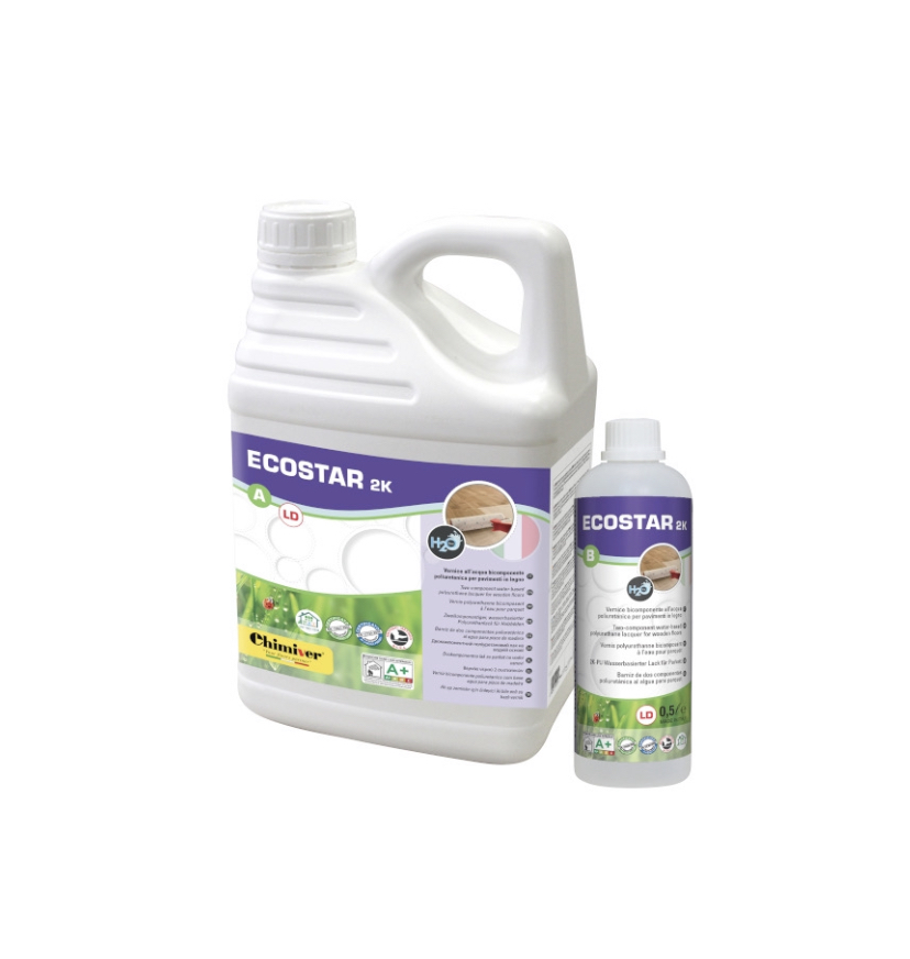 Dvokomponentni poliuretanski 10k na bazi vode za drveni pod ECOSTAR 2K je dvokomponentni poliuretanski lak na bazi vode za drvene podove, kojeg karakteriše visok sadržaj čvrste materije, lako se nanosi, visoka vlažnost pora čak i na brušenom drvetu, dajući topao i prijatan izgled tretiranom podu. Visoka otpornost na abraziju i jednosmjerne oznake omogućavaju upotrebu za velike površine saobraćaja.